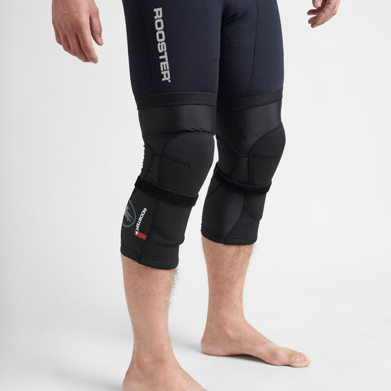 Long length knee pads that extend down to protect part of the shin. A streamlined fit with a silicon rubber elastic webbing strip at the top band and above the calf maintains the position of the knee pads, whilst an additional elastic strap is positioned just below the knee to further secure the pad in place. Comfort is enhanced through stretch panels around the main knee panel to allow stretch where you need it the most and improved movement, with a breathable mesh panel down the back to add breathability to the back of your leg. Durability and protection has been achieved to follow in our ‘Race Armour’ range, with the use of Duratex II at the outer surface and NBR rubber used on the inside – this has minimal water absorption so weight will not be added to the pads when wet, the properties of the rubber also mean that the pad will mould to your body slightly and also adds some shock absorption for those falls!