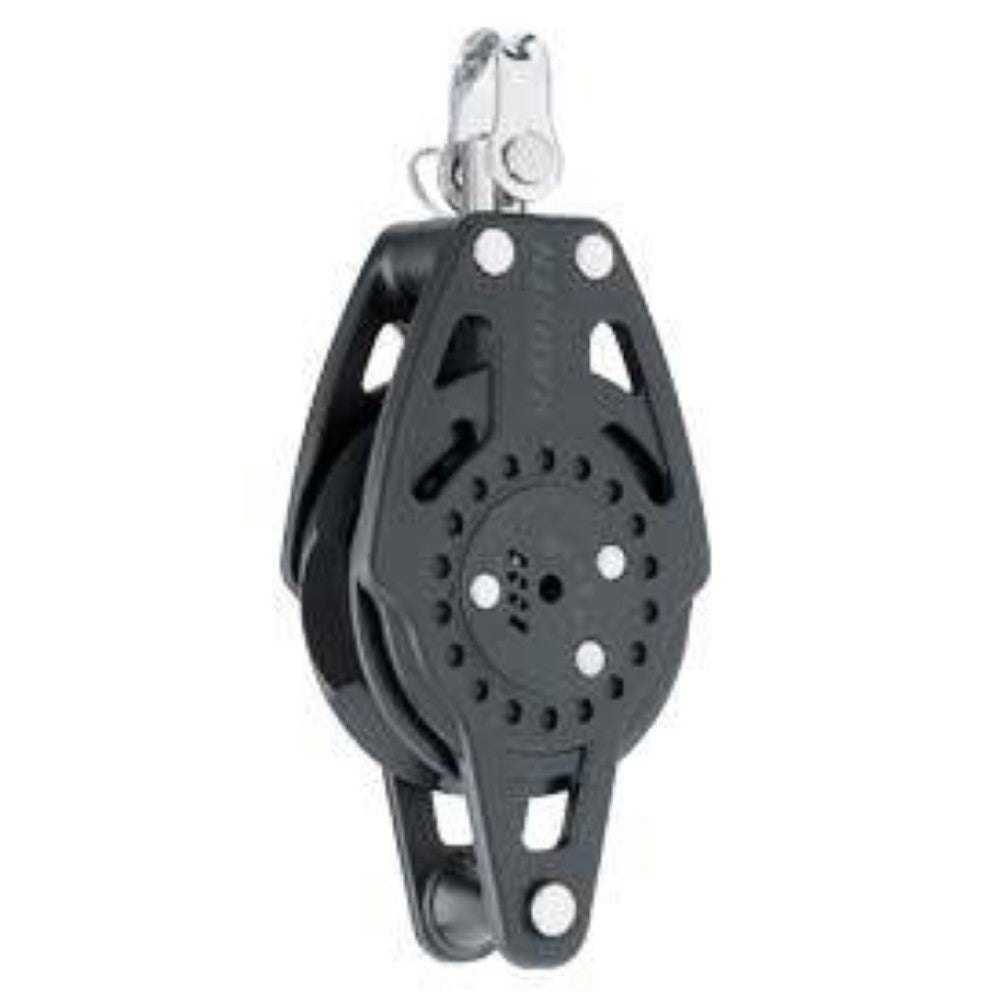 Harken 2626 57mm Ratchamatic Block with Becket. The Carbo Ratchmatic is a load sensing ratchet block that rolls freely in both directions under low loads and automatically engages the ratchet as loads increase. Shifting between ratchet and light air modes is seamless. unloaded main and jib sheets run out freely during mark roundings and asymmetrical spinnakers free instantly during jibes.