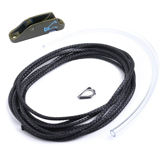 Topper Worlds Traveller Rope and Roller Metal Cleat 2:1 kit, using 4 mm pure Dyneema. File down your stock level with your tiller arm and this rope will last for a very long time.