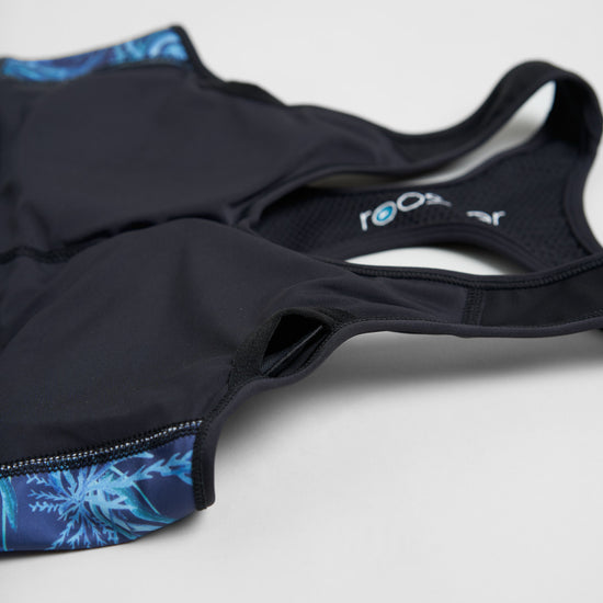 Medium Impact Sports Bra/Bikini top in signature Rooster Womens styling. Double layered throughout for added support and a racer back made from mesh enhances breathability. Wide yet soft elastic chest band keeps top securely in place.