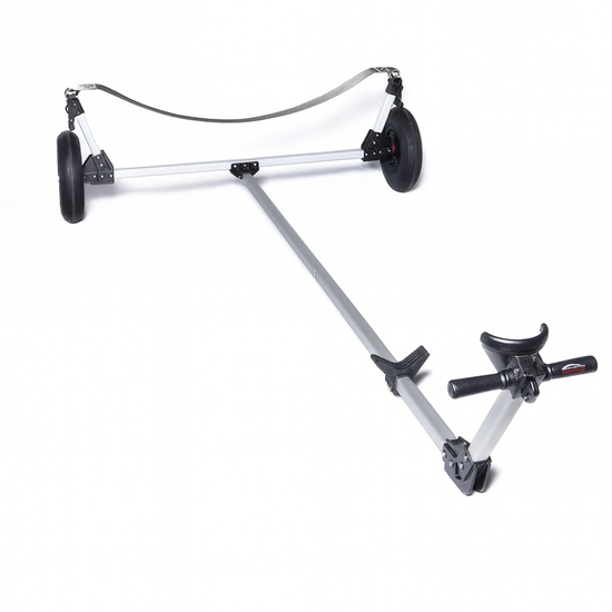 The Dynamic Type 2 dolly was designed for the ILCA / Laser. The tube sizing and balanced handle load make for easy manoeuvrability. Upgrade to larger wheels for beach launching. Dynamic Dolly, Type 2 Dolly style allows bow of boats with a curled gunwale to hang from a specifically shaped handle fitting. Snug-fitting edge trim atop the handle fitting protects the gunwale gelcoat. Type is suitable for Laser, Byte, Gig Harbor 16, and more. Boat-specific tube and sling lengths provide a custom fit for each boat, enabling a balanced handle load and easy manoeuvring. All joint fittings are through-bolted and designed for increased torque stability. Strong, 3” non-stretch, polyester sling provides wrap-around boat support. Adjustable, flexible V-fitting on tongue tube provides boat support forward of the sling and prevent boat and aluminium contact. Eyelets on sling and handle fittings facilitate securing boat to dolly in storage, on trailers or in racks. Tie down with the handle fitting eyelet helps prevent slippage on steep ramps. Easy dolly breakdown using the snap buttons on wheel shaft and tongue tube, as well as wing nuts on axle tube cross fitting. Pneumatic, non-corrosive, 16” x 4” wheels can be secured on wheel shaft with provided screws for added security. For soft sand conditions, tire pressure can be reduced to increase tire footprint.